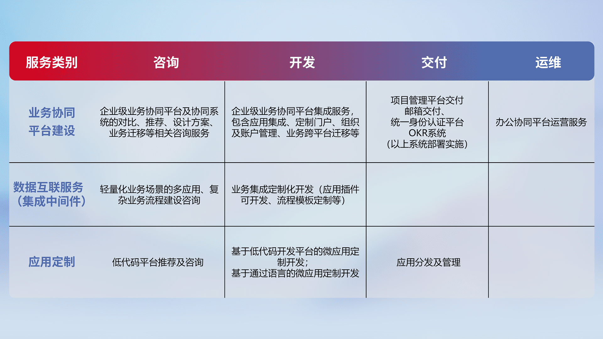 针对钉钉、、、、企微、、、IDaas等平台级产品提供产品的规划、、方案、、交付、、定制化开发等服务,,实现如统一协同办公、、、、智能客户服务、、、、混合会议管理、、智能数据查询、、、、等业务场景,,,实现数字化转型。。